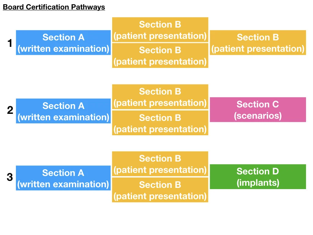 EVERYONE must take and pass Part A - the written examination. And then the challengers must complete AT LEAST 2 patient-based oral examinations. A THIRD patient-based oral examination can be pursued, OR a scenarios-based, OR implant-based oral examinations can be challenged (and passed) to finish the board examination round-up.
